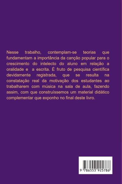 Nesse trabalho, contemplam-se teorias que fundamentam a importância da canção popular para o crescimento do intelecto do aluno em relação a oralidade