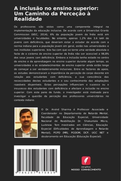 Os professores são vistos como uma componente integral na implementação da educação inclusiva. De acordo com a Universitat Grants Commission (UGC, 2014), 6% da população jovem da Índia está em universidades e faculdades. No entanto, apenas 1,2% dos 3,6 lakh de jovens com deficiência, que deveriam estar a estudar de acordo com a norma indiana para a população jovem em geral, estão nas universidades e nos institutos superiores. Isto faz com que se torne uma verdade absoluta o facto de o sistema de ensino superior da Índia não ser acessível a 98,8% dos seus jovens com deficiência. Embora a inclusão tenha estado no centro do ensino e da aprendizagem no ensino superior durante algum tempo, as universidades e os estabelecimentos de ensino superior ainda estão longe de começar a ser verdadeiramente inclusivos. Entre os factores de apoio, os estudos demonstraram a importância da perceção do corpo docente em relação aos estudantes com deficiência, a sua consciência das necessidades destes estudantes e o seu conhecimento das adaptações razoáveis disponíveis. Estas percepções influenciam o sucesso ou o insucesso dos estudantes com deficiência e afectam a inclusão no ensino superior. Com este pano de fundo, o investigador está motivado para investigar a questão da perceção dos professores universitários no contexto indiano.