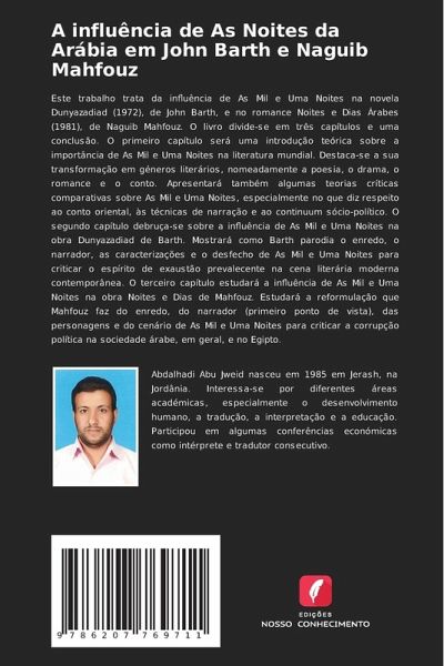 Este trabalho trata da influência de As Mil e Uma Noites na novela Dunyazadiad (1972), de John Barth, e no romance Noites e Dias Árabes (1981), de Naguib Mahfouz. O livro divide-se em três capítulos e uma conclusão. O primeiro capítulo será uma introdução teórica sobre a importância de As Mil e Uma Noites na literatura mundial. Destaca-se a sua transformação em géneros literários, nomeadamente a poesia, o drama, o romance e o conto. Apresentará também algumas teorias críticas comparativas sobre As Mil e Uma Noites, especialmente no que diz respeito ao conto oriental, às técnicas de narração e ao continuum sócio-político. O segundo capítulo debruça-se sobre a influência de As Mil e Uma Noites na obra Dunyazadiad de Barth. Mostrará como Barth parodia o enredo, o narrador, as caracterizações e o desfecho de As Mil e Uma Noites para criticar o espírito de exaustão prevalecente na cena literária moderna contemporânea. O terceiro capítulo estudará a influência de As Mil e Uma Noites na obra Noites e Dias de Mahfouz. Estudará a reformulação que Mahfouz faz do enredo, do narrador (primeiro ponto de vista), das personagens e do cenário de As Mil e Uma Noites para criticar a corrupção política na sociedade árabe, em geral, e no Egipto.