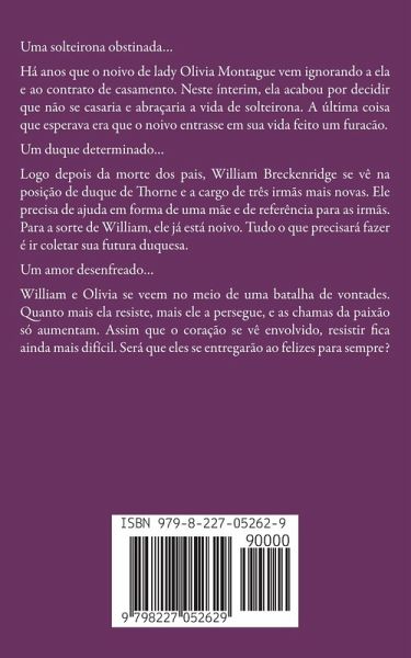 Uma solteirona obstinada... Há anos que o noivo de lady Olivia Montague vem ignorando a ela e ao contrato de casamento. Neste ínterim, ela acabou por decidir que não se casaria e abraçaria a vida de solteirona. A última coisa que esperava era que o noivo entrasse em sua vida feito um furacão. Um duque determinado... Logo depois da morte dos pais, William Breckenridge se vê na posição de duque de Thorne e a cargo de três irmãs mais novas. Ele precisa de ajuda em forma de uma mãe e de referência para as irmãs. Para a sorte de William, ele já está noivo. Tudo o que precisará fazer é ir coletar sua futura duquesa. Um amor desenfreado... William e Olivia se veem no meio de uma batalha de vontades. Quanto mais ela resiste, mais ele a persegue, e as chamas da paixão só aumentam. Assim que o coração se vê envolvido, resistir fica ainda mais difícil. Será que eles se entregarão ao felizes para sempre?