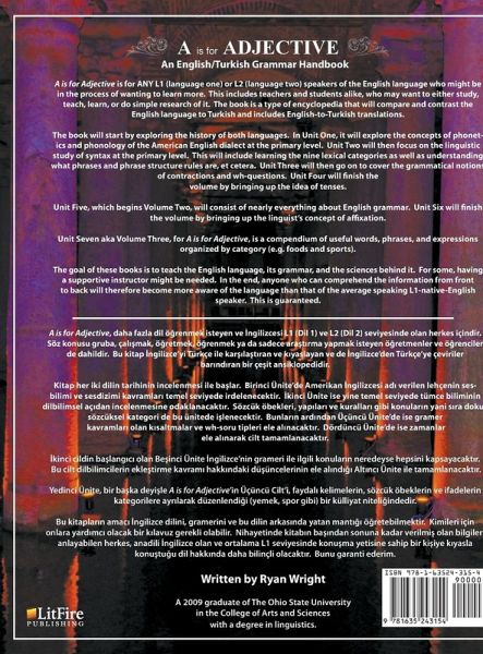 A is for Adjective is for ANY L1 (language one) or L2 (language two) speakers of the English language who might be in the process of wanting to learn more. This includes teachers and students alike, who may want to either study, teach, learn, or do simple research of it. The book is a type of encyclopedia that will compare and contrast the English language to Turkish and includes English-to-Turkish translations. The book will start by exploring the history of both languages. In Unit One, it will explore the concepts of phonetics and phonology of the American English dialect at the primary level. Unit Two will then focus on the linguistic study of syntax at the primary level. This will include learning the nine lexical categories as well as understanding what phrases and phrase structure rules are, et cetera. Unit Three will then go on to cover the grammatical notions of contractions and wh-questions. Unit Four will finish the volume by bringing up the idea of tenses. Unit Five, which begins Volume Two, will consist of nearly everything about English grammar. Unit Six will finish the volume by bringing up the linguist's concept of affixation. Unit Seven aka Volume Three, for A is for Adjective, is a compendium of useful words, phrases, and expressions organized by category (e.g. foods and sports). The goal of these books is to teach the English language, its grammar, and the sciences behind it. For some, having a supportive instructor might be needed. In the end, anyone who can comprehend the information from front to back will therefore become more aware of the language than that of the average speaking L1-native-English speaker. This is guaranteed.
