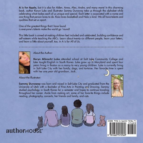 A is for Apple, but it is also for Alden, Anna, Alex, Andre, and many more! In this charming book, author Karyn Albrecht Luke and illustrator Sammy Dunaway take us through the alphabet while celebrating what makes each of us unique and special. Each letter is associated with a name and one thing that person loves to do. Kaia loves basketball and Nolo is kind. We all have talents and qualities that set us apart. One of the greatest things that I have found is everyone's talents make the world go 'round! This little book is aimed at making children feel included and celebrated, building confidence and self-esteem while teaching the ABCs. Learn about twenty-six different people, learn your letters, and learn a little about yourself, too, in A is for All of Us.