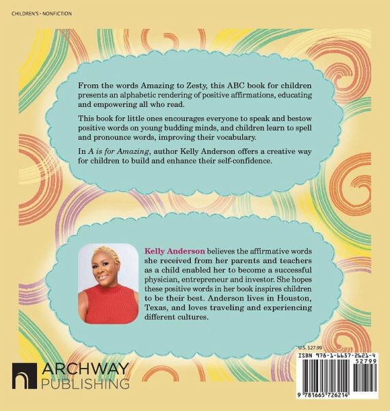 "A is for Amazing", is an ABC book for children about positive affirmations. One can never start too early to build and enhance self confidence at such a young age. It serves dual purposes. Everyone gets to speak and bestow positive words on young budding minds. Children also get to learn, spell and pronounce slightly more difficult and lengthier words therefore improving their vocabulary at a young age. These children will be exceptional spotlights with an advanced vocabulary."