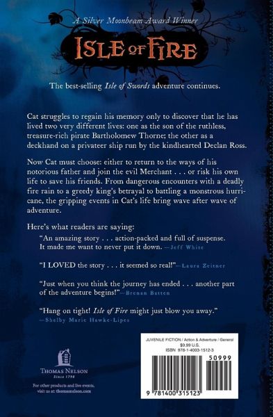 Brace yourself for a thrilling high-seas adventure and dare to set sail for the Isle of Fire."A great explosion rocked the crowded harbor. The ferocious blaze engulfed ship after ship expanding the circle of destruction in mere heartbeats. The fire rain had been unleashed."As Cat's memory returns, he realizes that he has lived two very different lives. Now he must choose whether to return to the ways of his notorious father and join the evil Merchant, or defy the Merchant and risk his life to save his friends.The best-selling Isle of Swords adventure continues in Isle of Fire as ancient mariners rise from legend and cut an all-too-real swath of destruction across the Atlantic. The newly formed Wolf Fleet scours the Caribbean, hunting the pirates they once called comrades. And in the pitiless winds of a monstrous hurricane, whole fleets will be blasted apart and devoured.