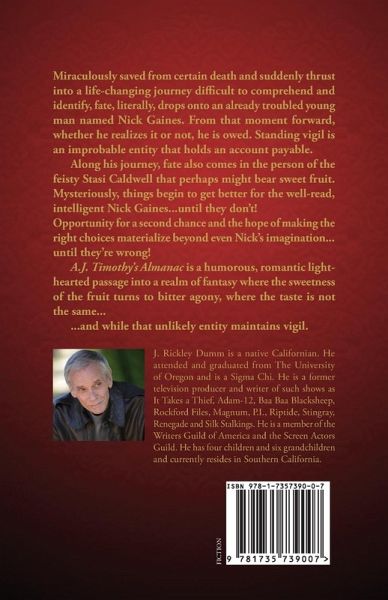 Miraculously saved from certain death and suddenly thrust into a life-changing journey difficult to comprehend and identify, fate, literally, drops onto an already troubled young man named Nick Gaines. From that moment forward, whether he realizes it or not, he is owed. Standing vigil is an improbable entity that holds an account payable. Along his journey, fate also comes in the person of the feisty Stasi Caldwell that perhaps might bear sweet fruit. Mysteriously, things begin to get better for the well-read, intelligent Nick Gaines...until they don't! Opportunity for a second chance and the hope of making the right choices materialize beyond even Nick's imagination...until they're wrong! A.J. Timothy's Almanac is a humorous, romantic light-hearted passage into a realm of fantasy where the sweetness of the fruit turns to bitter agony, where the taste is not the same... ...and while that unlikely entity maintains vigil.