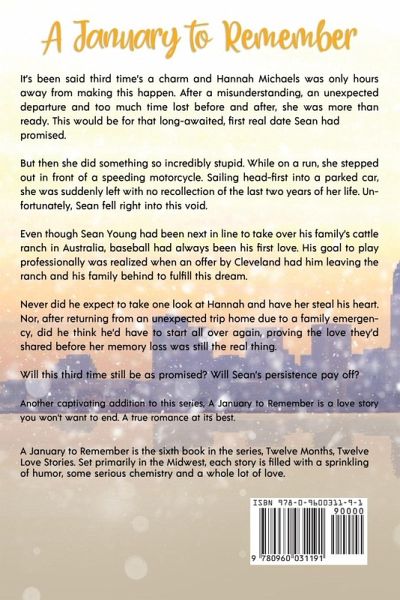 It's been said third time's a charm and Hannah Michaels was only hours away from making this happen. After a misunderstanding, an unexpected departure and too much time lost before and after, she was more than ready. This would be for that long-awaited, first real date Sean had promised. But then she did something so incredibly stupid. While on a run, she stepped out in front of a speeding motorcycle. Sailing head-first into a parked car, she was suddenly left with no recollection of the last two years of her life. Unfortunately, Sean fell right into this void. Even though Sean Young had been next in line to take over his family's cattle ranch in Australia, baseball had always been his first love. His goal to play professionally was realized when an offer by Cleveland had him leaving the ranch and his family behind to fulfill this dream. Never did he expect to take one look at Hannah and have her steal his heart. Nor, after returning from an unexpected trip home due to a family emergency, did he think he'd have to start all over again, proving the love they'd shared before her memory loss was still the real thing. Will this third time still be as promised? Will Sean's persistence pay off? Another captivating addition to this series, A January to Remember is a love story you won't want to end. A true romance at its best.