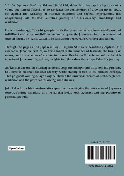 " In "A Japanese Boy" by Shigemi Shiukichi, delve into the captivating story of a young boy named Takeshi as he navigates the complexities of growing up in Japan. Set against the backdrop of cultural traditions and societal expectations, this enlightening tale follows Takeshi's journey of self-discovery, friendship, and resilience. From a tender age, Takeshi grapples with the pressures of academic excellence and fulfilling familial responsibilities. As he navigates the Japanese education system and societal norms, he learns valuable lessons about perseverance, respect, and honor. Through the pages of "A Japanese Boy," Shigemi Shiukichi beautifully captures the essence of Japanese culture, weaving together the vibrancy of festivals, the beauty of nature, and the wisdom of ancient traditions. Readers will be immersed in the rich tapestry of Japanese life, gaining insights into the values that shape Takeshi's journey. As Takeshi encounters challenges, forms deep friendships, and discovers his passions, he learns to embrace his own identity while staying rooted in his cultural heritage. This poignant coming-of-age story celebrates the universal themes of self-acceptance, resilience, and the power of following one's dreams. Join Takeshi on his transformative quest as he navigates the intricacies of Japanese society, finding his place in a world that holds both tradition and the promise of personal growth."