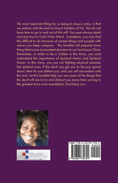 The most important thing for us being in Jesus's army, is that we endure until the end as Good Soldiers of His. You do not have time to go in and out of His will. You must always stand and stay true to God's Holy Word. Sometimes, you may find this difficult to do because of certain things and people with whom you keep company. This booklet will pinpoint some things that cause inconsistent devotion to our Lord Jesus Christ. Remember, in order to be a Soldier in this Army, you must understand the importance of Spiritual Armor and Spiritual Power. In this Army, you are not fighting physical enemies but spiritual ones. If the devil can get you to let your guard down, then he can defeat you; and you will not endure until the end. Let this booklet help you see some of the things that the devil will use to try and distract you away from serving in the greatest Army ever assembled. God bless you.
