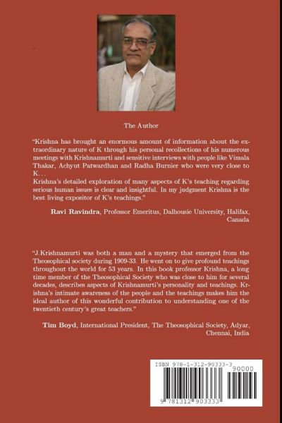 This book gives an intimate portrayal of the philosopher sage Jiddu Krishnamurti by several of his colleagues who knew him over many decades and interacted with him closely. It reveals several aspects of the man and investigates his teachings in depth. The author, Professor P.Krishna, was a Professor of Physics and was closely associated with him for nearly 3 decades. He has lectured all over the world and conducted dialogues about Krishnamurti's teachings.
