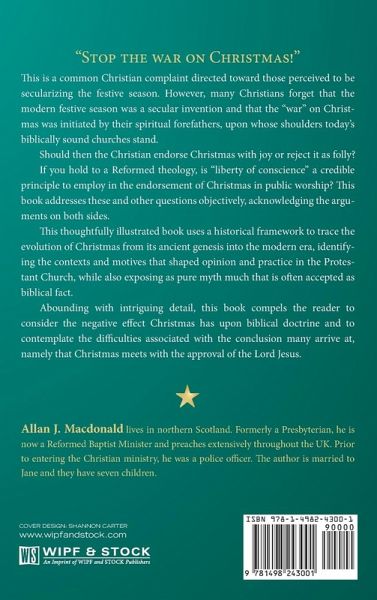 ""Stop the war on Christmas!"" This is a common Christian complaint directed toward those perceived to be secularizing the festive season. However, many Christians forget that the modern festive season was a secular invention and that the ""war"" on Christmas was initiated by their spiritual forefathers, upon whose shoulders today's biblically sound churches stand. Should then the Christian endorse Christmas with joy or reject it as folly? If you hold to a Reformed theology, is ""liberty of conscience"" a credible principle to employ in the endorsement of Christmas in public worship? This book addresses these and other questions objectively, acknowledging the arguments on both sides. This thoughtfully illustrated book uses a historical framework to trace the evolution of Christmas from its ancient genesis into the modern era, identifying the contexts and motives that shaped opinion and practice in the Protestant Church, while also exposing as pure myth much that is often accepted as biblical fact. Abounding with intriguing detail, this book compels the reader to consider the negative effect Christmas has upon biblical doctrine and to contemplate the difficulties associated with the conclusion many arrive at, namely that Christmas meets with the approval of the Lord Jesus.
