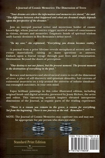 A journal from a prior lifetime reveals metaphysical secrets and how events materialized, raising as many questions as answers. Standard Illustrated Edition, Color illustrations, Paperback, 6"x9". This book received an outpouring of worldwide interest for themes of mysticism and universal spirituality.#1 Hot New Release, Amazon.in, "reincarnation," 4/26/2021, #5 Bestseller, Amazon.in, "reincarnation" 4/26/2021. A mind-bending work of literary fiction. "Amazing. Must read... Thought provoking... profound imagery... magical... So thankful for this beautiful mind and his eloquent work of art that this book is!" Goodreads.com review. ¿¿¿ Join an intrepid journal writer and mysterious holder of cosmic knowledge, whose journal entries trigger mystical states of consciousness in visions, dreams and memories. Spiritual wisdom flows over centuries and lifetimes in this mind-bending work of metaphysical fiction. The story retraces soul memories and states of consciousness through past lives and reincarnation to arrive in the dimension of trees, a beautiful place of soul-discovery and quantum absurdity. Spellbinding and emotionally charged, the Journal contains secret cosmic truths surrounding its original purpose and author, and rewards of ancient hidden knowledge and understanding. Will you sail the currents of existential awareness on a trip to experience the Journal of Cosmic Memories? Destination: Beyond the doors of perception. ¿¿¿ Excerpts: "Your dreams are where the information and memories are stored," she said. "The difference between what happened and what you dreamed simply depends upon the perspective of the dreamer." "What looks like light organizes into data," she explained. "When you see light transferred from the sun, to the trees, through the coils, to the light bodies, you understand the light bodies download and upload data, containing information, knowledge, thoughts, emotions, experiences, desires, and everything else in existence." "In my studio, you are not in the dimension of trees while awake, but only when you sleep. Everything you read in my journals came to me in my own dreams in this dimension, but in other dimensions these events happened to me and everything you dream has happened and will happen to you in some dimension. Your consciousness is everywhere, in every dimension, experiencing each possibility, all at the same time." "We sat there, together under the trees, for what seemed like an entire lifetime. Well, actually, it was an entire lifetime. Once you plant a seed of consciousness, a tree starts to grow, and grows along with you during your lifetime. These trees reside in a dimension not normally accessible. "The first thing to know about the dimension of trees is that each of us has a tree." "Guided only by the constraints of nature, like sunlight, season and rain, they transfer the positive energy of light and love from the sunshine they receive into the network of trees below, pumping spiritual light into the roots of other trees. In turn, these trees forge a spiritual connection to their soul companions, who sit beneath the tree receiving light energies. These energies sustain the souls with pure vibrations." "There is a reason you remain in the grove, a reason for everything. Set from the beginning. There is one journey at the end. Remember."