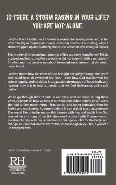 IS THERE A STORM RAGING IN YOUR LIFE? YOU ARE NOT ALONE! Lanette Black Escobar was a business woman for twenty years and in full time ministry as founder of Financial Freedom Christian Counseling, when a storm whipped up and suddenly the course of her life was changed forever. This mother of three and grandmother of five suddenly found herself falsely accused and imprisoned for a crime she did not commit. With a sentence of fifty-four months, Lanette was about to embark on a journey that she would never forget. Lanette shares how the Word of God brought her safely through the storm that could have shipwrecked her faith. Learn how God transformed her pain, struggles, and hardships into a passionate message of hope, truth, and healing; how it is in total surrender that we find deliverance and a safe harbor. We all go through difficult time in our lives, what we learn, during these times, depends on how we look at our situations. While behind prison walls, she had to face many things - fear, cancer, and being separated from her family, and much more. A Journey behind Prison Walls is just that, a journey. She would like to invite you on this journey with her; and watch how God blessed her, and many others that she came in contact with. The journey you are about to take with her is one that can change your life for the better and change your outlook on the storms that come and go in your life, if you let it - it changed hers.
