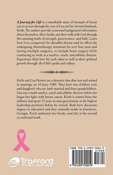 A Journey for Life is a remarkable story of triumph of breast cancer as seen through the eyes of Lisa and her devoted husband, Keith. The authors provide contextual background information about themselves, their family, and their walk with God through this amazing battle of strength, perseverance, and faith. Learn how Lisa conquered the dreadful disease and its effects by undergoing chemotherapy treatment for over four years and having multiple surgeries, to include brain surgery while continuing to work as a teacher, coach, and athletic director. Experience their love for each other as well as their spiritual growth through all of life's peaks and valleys.
