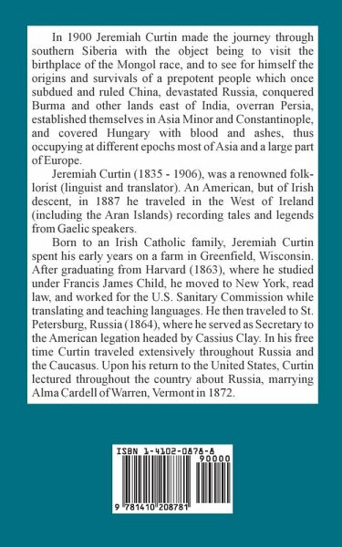 In 1900 Jeremiah Curtin made the journey through southern Siberia with the object being to visit the birthplace of the Mongol race, and to see for himself the origins and survivals of a prepotent people which once subdued and ruled China, devastated Russia, conquered Burma and other lands east of India, overran Persia, established themselves in Asia Minor and Constantinople, and covered Hungary with blood and ashes, thus occupying at different epochs most of Asia and a large part of Europe. Jeremiah Curtin (1835 - 1906), was a renowned folk-lorist (linguist and translator). An American, but of Irish descent, in 1887 he traveled in the West of Ireland (including the Aran Islands) recording tales and legends from Gaelic speakers. Born to an Irish Catholic family, Jeremiah Curtin spent his early years on a farm in Greenfield, Wisconsin. After graduating from Harvard (1863), where he studied under Francis James Child, he moved to New York, read law, and worked for the U.S. Sanitary Commission while translating and teaching languages. He then traveled to St. Petersburg, Russia (1864), where he served as Secretary to the American legation headed by Cassius Clay. In his free time Curtin traveled extensively throughout Russia and the Caucasus. Upon his return to the United States, Curtin lectured throughout the country about Russia, marrying Alma Cardell of Warren, Vermont in 1872.