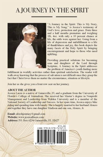 A Journey in The Spirit: This is My Story, This is My Song is Jessica Lucas' story about miracles and God's awesome power. Born 3 and 1/2 months premature with only a 10 percent chance to live, the odds were against her, but God proved himself once again. Jessica's story chronicles her life growing up as a young girl into womanhood. Going from a life of depression and anxiety to a life of joy and thankfulness, A Journey in the Spirit proves to give the reader encouragement and will uplift those who need a positive change i.n their lives. So, join her as she gives you a front row seat on her journey. This book provides scripture to practical situations that face America's youth who want to be sons and daughters of God.