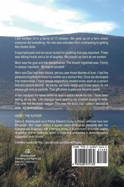 I am number 13 in a family of 17 children. We grew up on a farm where everyone did everything. No one was excluded from contributing to getting the chores done. It was hard work and we never lacked for anything that was important. There was sibling rivalry and a lot of laughter. We played as hard as we worked.Mom was the glue and the disciplinarian. The lesson ingrained was: Family is always important. Be true to yourself. Mom and Dad had their issues, yet you saw those flashes of love. I had the pleasure of getting to know my mother as a woman first. Once we developed that relationship, I have always respectfully treated every adult as a person first and parent second. As adults, we have needs and those needs do not always get met as parents. That gift alone is precious beyond words.A tear escaped my father while he read a piece I wrote for him. I have been writing all my life. Life changes have sparked my creative energy to write. This was not the book I began. This was the book that I always wanted to write: my poetry/prose.About the AuthorDiane E. Peeling grew up in Prince Edward County in Ontario and now lives near Edmonton. She began writing a journal called Divorce by Dementia after her husband was diagnosed with a terminal illness. "I found myself on a roller coaster of emotion with no particular outlet. A nurse that specialized in dementia testing suggested I write a book."