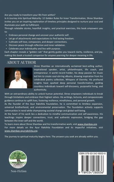 Shree Shambav is an internationally acclaimed, best-selling author, inspirational speaker, artist, philanthropist, life coach, and entrepreneur. A world record holder with 36+ best-selling titles to his name, Shree Shambav is known for his transformative insights that bridge the realms of spiritual wisdom, personal growth, poetic beauty, and technical mastery.His literary journey began with the powerful Journey of Soul - Karma, a work that resonated deeply with readers and set the tone for a body of work rooted in introspection, healing, and purposeful living. From the widely embraced Twenty + One Series to the Life-Changing Journey - Inspirational Quotes collection, his writings have inspired thousands to embark on their own inner journeys.A poet at heart, Shree's soul-stirring albums and lyrical compositions-especially Whispers of Eternity: 150 Plus - A Symphony of Soulful Verses and Whispers of the Soul: A Journey Through Haiku-capture the essence of human emotion with haunting beauty. His artistic sensitivity is matched by his technical brilliance, showcased in the Optimum - Python Power Series I to IV and the eye-opening Unveiling the Enigma: Death - Light of Life and the Shadow of Death.His recent works, such as Learn to Love Yourself, The Power of Letting Go, Whispers of a Dying Soul, and Awakening the Infinite, delve into the human psyche with compassion and clarity, offering timeless guidance for self-discovery and emotional healing. His Beyond the Veil series fearlessly explores life after death, merging science, spirituality, and mysticism into an awe-inspiring narrative.An alumnus of the Indian Institute of Management and the National Institute of Technology, Shree brings with him rich professional experience from the corporate world. This unique blend of intellectual rigor and soulful expression empowers him to guide readers from all walks of life.Shree has recently expanded into metaphysical studies with the Astrology Unveiled - Foundations of Ancient Wisdom series (I to VI), demystifying Vedic astrology and enriching it with spiritual depth and practical relevance.A true humanitarian, Shree Shambav founded the Ayur Rakshita Foundation, a non-profit organization dedicated to universal upliftment, environmental harmony, and community well-being. His work through the foundation reflects his belief in the boundless potential of the human spirit and the power of unity.To learn more about his books, music, and mission, visit www.shambav.orgTo explore the charitable initiatives of his foundation, visit www.shambav-ayurrakshita.org