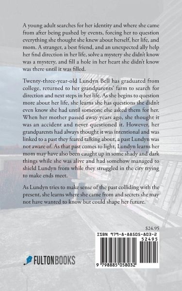 A young adult searches for her identity and where she came from after being pushed by events, forcing her to question everything she thought she knew about herself, her life, and mom. A stranger, a best friend, and an unexpected ally help her find direction in her life, solve a mystery she didn't know was a mystery, and fill a hole in her heart she didn't know was there until it was filled. Twenty-three-year-old Lundyn Bell has graduated from college, returned to her grandparents' farm to search for direction and next steps in her life. As she begins to question more about her life, she learns she has questions she didn't even know she had until someone else asked them for her. When her mother passed away years ago, she thought it was an accident and never questioned it. However, her grandparents had always thought it was intentional and was linked to a past they feared talking about, a past Lundyn was not aware of. As that past comes to light, Lundyn learns her mom may have also been caught up in some shady and dark things while she was alive and had somehow managed to shield Lundyn from while they struggled in the city trying to make ends meet. As Lundyn tries to make sense of the past colliding with the present, she learns where she came from and secrets she may not have wanted to know but could shape her future.