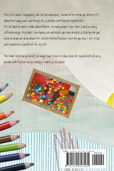 This isn't about Geography, no hills or mountains, bottom of the ocean or ditches it's about the happy and sad things I, a person with Autism, experience. It's so hard to write a book about Autism, so many people have done it and in many different ways. My book, I am hoping, will not teach you how to raise a child or tell you what to do or not do or about the science behind Autism, it will tell you how I see, hear and experience aspects of life, my life. This book holds no answers, no magic cures but it is true real life experiences of me, a person with Autism living in today's world as an adult. I hope it makes you laugh, sigh, smile and maybe at times see a little bit of sadness because that's what I felt writing it, all of those things. There is no point hiding the hard bits but equally there is no point dismissing the good and there is plenty of that!