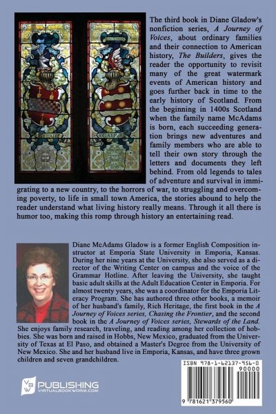 The third book in Diane Gladow's nonfiction series, A Journey of Voices, about ordinary families and their connection to American history, The Builders, gives the reader the opportunity to revisit many of the great watermark events of American history and goes further back in time to the early history of Scotland. From the beginning of the family name, McAdams, in Scotland in the 1400s to the small-town boy who was highly decorated in VVVVII, each generation brings new adventures and family members who were able to tell their own story through letters and documents they left behind. From old legends to tales of adventure and survival in immigrating to a new country, to the horrors of war, to struggling and overcoming poverty, to life in small town America, the stories abound to help the reader understand what living history really meant. Through it all there was humor too, making this romp through history an entertaining read.