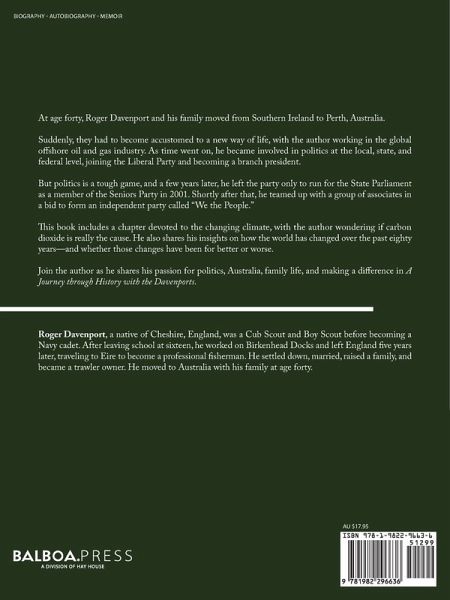 At age forty, Roger Davenport and his family moved from Southern Ireland to Perth, Australia. Suddenly, they had to become accustomed to a new way of life, with the author working in the global offshore oil and gas industry. As time went on, he became involved in politics at the local, state, and federal level, joining the Liberal Party and becoming a branch president. But politics is a tough game, and a few years later, he left the party only to run for the State Parliament as a member of the Seniors Party in 2001. Shortly after that, he teamed up with a group of associates in a bid to form an independent party called "We the People." This book includes a chapter devoted to the changing climate, with the author wondering if carbon dioxide is really the cause. He also shares his insights on how the world has changed over the past eighty years-and whether those changes have been for better or worse. Join the author as he shares his passion for politics, Australia, family life, and making a difference in A Journey through History with the Davenports.