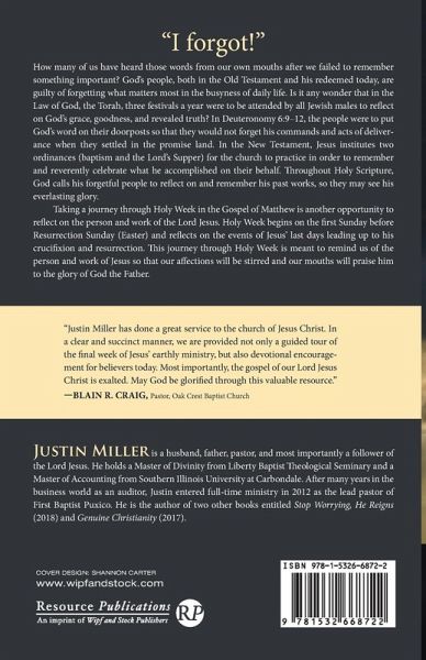 ""I forgot!"" How many of us have heard those words from our own mouths after we failed to remember something important? God's people, both in the Old Testament and his redeemed today, are guilty of forgetting what matters most in the busyness of daily life. Is it any wonder that in the Law of God, the Torah, three festivals a year were to be attended by all Jewish males to reflect on God's grace, goodness, and revealed truth? In Deuteronomy 6:9-12, the people were to put God's word on their doorposts so that they would not forget his commands and acts of deliverance when they settled in the promise land. In the New Testament, Jesus institutes two ordinances (baptism and the Lord's Supper) for the church to practice in order to remember and reverently celebrate what he accomplished on their behalf. Throughout Holy Scripture, God calls his forgetful people to reflect on and remember his past works, so they may see his everlasting glory. Taking a journey through Holy Week in the Gospel of Matthew is another opportunity to reflect on the person and work of the Lord Jesus. Holy Week begins on the first Sunday before Resurrection Sunday (Easter) and reflects on the events of Jesus' last days leading up to his crucifixion and resurrection. This journey through Holy Week is meant to remind us of the person and work of Jesus so that our affections will be stirred and our mouths will praise him to the glory of God the Father. Justin Miller is a husband, father, pastor, and most importantly a follower of the Lord Jesus. He holds a Master of Divinity from Liberty Baptist Theological Seminary and a Master of Accounting from Southern Illinois University at Carbondale. After many years in the business world as an auditor, Justin entered full-time ministry in 2012 as the lead pastor of First Baptist Puxico. He is the author of two other books entitled Stop Worrying, He Reigns (2018) and Genuine Christianity (2017).