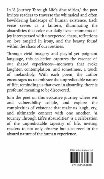 In "A Journey Through Life's Absurdities," the poet invites readers to traverse the whimsical and often bewildering landscape of human existence. Each verse serves as a lantern, illuminating the absurdities that color our daily lives-moments of joy interspersed with unexpected chaos, reflections on love tangled in irony, and the beauty found within the chaos of our routines. Through vivid imagery and playful yet poignant language, this collection captures the essence of our shared experiences-moments that evoke laughter, contemplation, and sometimes, a touch of melancholy. With each poem, the author encourages us to embrace the unpredictable nature of life, reminding us that even in absurdity, there is profound meaning to be discovered. Join the poet on this evocative journey where wit and vulnerability collide, and explore the complexities of existence that make us laugh, cry, and ultimately connect with one another. "A Journey Through Life's Absurdities" is a celebration of the unpredictable tapestry of life, inviting readers to not only observe but also revel in the absurd nature of the human experience.