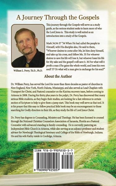 A study of the four gospels. Insightful truths about God's word that you might have missed in your previous studies. Dr. William Perry is a prolific writer of outstanding books. His titles for Newburgh Press thus far are Christians Helping Christians, Christian Counseling for the 21st Century and Theology for the 21st Century. Each book is a must for every reader of solid Christian material. I am happy to endorse Dr. Perry’s latest treasure, "A Journey Through The Gospels." Every student and preacher/teacher of the Bible needs this book for the desk or the bedside table. You will enjoy reading insights and valuable lessons that many casual readers of the Bible will miss. While this book is not lengthy you will find a delightful study of each gospel that will make you appreciate the wonderful gospel stories and love Jesus even more. To God be the glory! Dr. Glenn Mollette, President Newburgh Theological Seminary Newburgh, Indiana