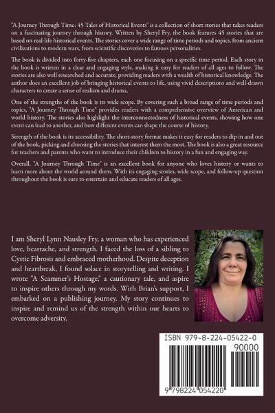 "A Journey Through Time: 45 Tales of Historical Events" is a collection of short stories that takes readers on a fascinating journey through history. Written by Sheryl Fry, the book features 45 stories that are based on real-life historical events. The stories cover a wide range of time periods and topics, from ancient civilizations to modern wars, from scientific discoveries to famous personalities. The book is divided into forty-five chapters, each one focusing on a specific time period. Each story in the book is written in a clear and engaging style, making it easy for readers of all ages to follow. The stories are also well researched and accurate, providing readers with a wealth of historical knowledge. The author does an excellent job of bringing historical events to life, using vivid descriptions and well-drawn characters to create a sense of realism and drama. One of the strengths of the book is its wide scope. By covering such a broad range of time periods and topics, "A Journey Through Time" provides readers with a comprehensive overview of American and world history. The stories also highlight the interconnectedness of historical events, showing how one event can lead to another, and how different events can shape the course of history. Strength of the book is its accessibility. The short-story format makes it easy for readers to dip in and out of the book, picking and choosing the stories that interest them the most. The book is also a great resource for teachers and parents who want to introduce their children to history in a fun and engaging way. Overall, "A Journey Through Time" is an excellent book for anyone who loves history or wants to learn more about the world around them. With its engaging stories, wide scope, and follow-up question throughout the book is sure to entertain and educate readers of all ages.