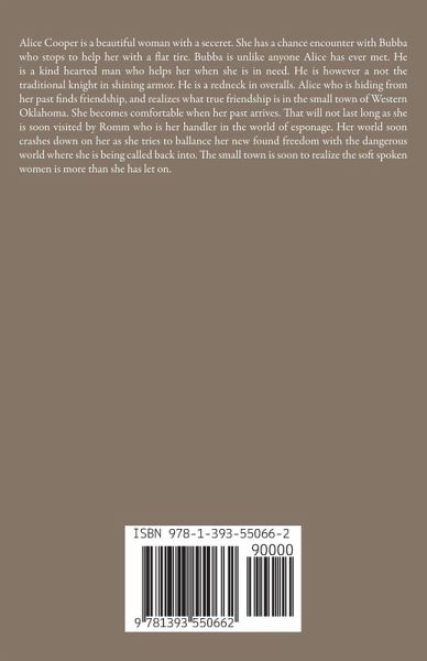 Alice Cooper is a beautiful woman with a seceret. She has a chance encounter with Bubba who stops to help her with a flat tire. Bubba is unlike anyone Alice has ever met. He is a kind hearted man who helps her when she is in need. He is however a not the traditional knight in shining armor. He is a redneck in overalls. Alice who is hiding from her past finds friendship, and realizes what true friendship is in the small town of Western Oklahoma. She becomes comfortable when her past arrives. That will not last long as she is soon visited by Romm who is her handler in the world of esponage. Her world soon crashes down on her as she tries to ballance her new found freedom with the dangerous world where she is being called back into. The small town is soon to realize the soft spoken women is more than she has let on.