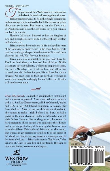 The purpose of this Workbook is a continuation of the book, but only addressing the scriptures. Trina Shepherd wants to help the Single community and encourage you to wait on the Lord. He has not forgotten about you, yes it hard. But I want to say that if you walk in Obedience and do as the scriptures says, you can ask the Lord for a mate. Matthew 6:33 state. But seek ye first the kingdom of God and his righteousness and all of these things shall be added unto you. Trina searches her decisions in life and applies some of the following scriptures, use in the book. She suggests that the reader get deeper into the word of God and draw closer to the lord. Wait for your Soulmate. Trina made alot of mistakes but you don't have to. The Lord had Mercy on her and her children. While desiring to have a Soulmate, we have to prepare for them, they are a Ministry. If we trust the Lord and allow him to send you who he has for you, life will not be such a struggle. We must learn to Trust the Lord. As we begin to search our thoughts and apply his word, then our Creator will send us our mate.