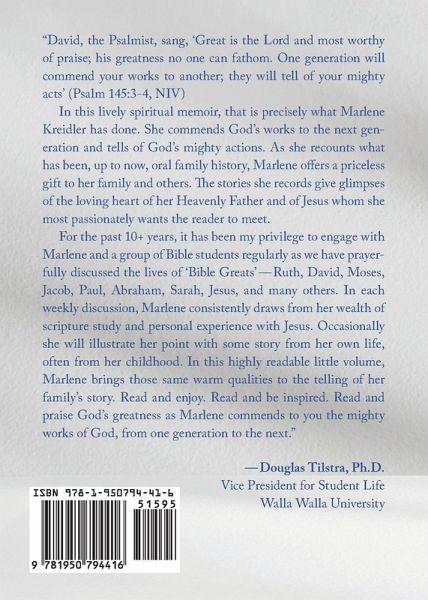 David, the Psalmist, sang, "Great is the Lord and most worthy of praise; his greatness no one can fathom. One generation will commend your works to another; they will tell of your mighty acts." (Psalm 145:3-4, NIV) In this lively spiritual memoir, that is precisely what Marlene Kreidler has done. She commends God's works to the next generation and tells of God's mighty actions. As she recounts what has been, up to now, oral family history, Marlene offers a priceless gift to her family and others. The stories she records give glimpses of the loving heart of her Heavenly Father and of Jesus whom she most passionately wants the reader to meet. For the past 10+ years it has been my privilege to engage with Marlene and a group of Bible students regularly as we have prayerfully discussed the lives of "Bible Greats"-Ruth, David, Moses, Jacob, Paul, Abraham, Sarah, Jesus, and many others. In each weekly discussion Marlene consistently draws from her wealth of scripture study and personal experience with Jesus. Occasionally she will illustrate her point with some story from her own life, often from her childhood. In this highly readable little volume, Marlene brings those same warm qualities to the telling of her family's story. Read and enjoy. Read and be inspired. Read and praise God's greatness as Marlene commends to you the mighty works of God, from one generation to the next. Douglas Tilstra, Ph.D. Vice President for Student Life Walla Walla University