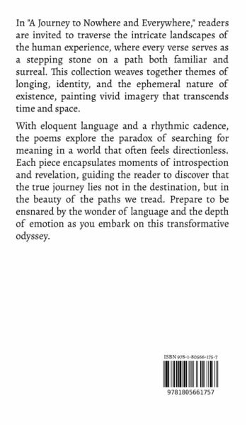 In "A Journey to Nowhere and Everywhere," readers are invited to traverse the intricate landscapes of the human experience, where every verse serves as a stepping stone on a path both familiar and surreal. This collection weaves together themes of longing, identity, and the ephemeral nature of existence, painting vivid imagery that transcends time and space. With eloquent language and a rhythmic cadence, the poems explore the paradox of searching for meaning in a world that often feels directionless. Each piece encapsulates moments of introspection and revelation, guiding the reader to discover that the true journey lies not in the destination, but in the beauty of the paths we tread. Prepare to be ensnared by the wonder of language and the depth of emotion as you embark on this transformative odyssey.