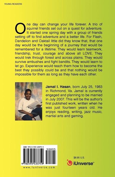 One day can change your life forever. A trio of squirrel friends set out on a quest for adventure. It started one spring day with a group of friends setting off to find adventure and a better life. For Flash, Dandelion and Oaktail little did they know that, that one day would be the beginning of a journey that would be remembered for a lifetime. They would learn teamwork, friendship, trust, courage and above all LOVE. They would trek through forest and across plains. They would survive ambushes and fight bandits. They would learn to let go. Experience would teach them how to become the best they possibly could be and that nothing would be impossible for them as long as they have each other.