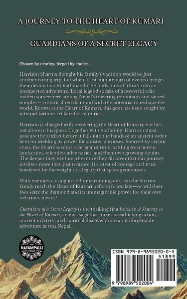 A sacred relic. A prophecy whispered through time. A journey that will change everything. Harrison Sharma never wanted to go to Nepal. He expected little more than crowded markets, temple tours, and a long, uneventful vacation. But from the moment he steps foot in Kathmandu, something feels off-like the past is reaching for him. A silent goddess who seems to whisper to his soul. An ancient parchment that changes for each who dares to read it. A shadow that moves just beyond sight. The signs are there, though Harrison refuses to see them-until he no longer has a choice. The Heart of Kumari, a fabled crimson diamond of unimaginable power, is more than legend. And he is bound to it in ways he cannot yet comprehend. But he is not the only one searching. A secretive guild moves in silence, watching. Trust is fleeting. Betrayal, inevitable. As the Sharma family journeys deeper into Nepal-from sacred mountaintop temples to the untamed jungles of Chitwan-fate and deception close in around them. The path forward is shrouded in mystery. And the line between friend and foe is dangerously thin. Guardians of a Secret Legacy is the first book in A Journey to the Heart of Kumari, a sweeping young adult adventure steeped in ancient myth, spiritual wonder, and the breathless pull of destiny.
