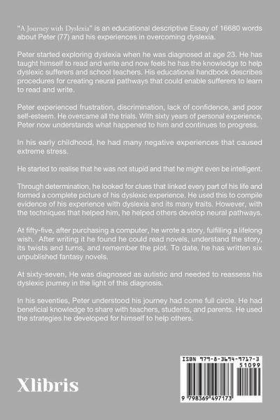 "A Journey with Dyslexia" is an educational descriptive Essay of 16680 words about Peter (77) and his experiences in overcoming dyslexia. Peter started exploring dyslexia when he was diagnosed at age 23. He has taught himself to read and write and now feels he has the knowledge to help dyslexic sufferers and school teachers. His educational handbook describes procedures for creating neural pathways that could enable sufferers to learn to read and write. Peter experienced frustration, discrimination, lack of confidence, and poor self-esteem. He overcame all the trials. With sixty years of personal experience, Peter now understands what happened to him and continues to progress. In his early childhood, he had many negative experiences that caused extreme stress. He started to realise that he was not stupid and that he might even be intelligent. Through determination, he looked for clues that linked every part of his life and formed a complete picture of his dyslexic experience. He used this to compile evidence of his experience with dyslexia and its many traits. However, with the techniques that helped him, he helped others develop neural pathways. At fifty-five, after purchasing a computer, he wrote a story, fulfilling a lifelong wish. After writing it he found he could read novels, understand the story, its twists and turns, and remember the plot. To date, he has written six unpublished fantasy novels. At sixty-seven, He was diagnosed as autistic and needed to reassess his dyslexic journey in the light of this diagnosis. In his seventies, Peter understood his journey had come full circle. He had beneficial knowledge to share with teachers, students, and parents. He used the strategies he developed for himself to help others.