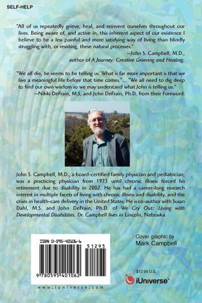 All of us repeatedly grieve, heal, and reinvent ourselves throughout our lives. Being aware of, and active in, this inherent aspect of our existence I believe to be a less painful and more satisfying way of living than blindly struggling with, or resisting, these natural processes.-John S. Campbell, M.D., author of A Journey: Creative Grieving and Healing. "We all die, he seems to be telling us. What is far more important is that we live a meaningful life before that time comes.". "We all need to dig deep to find our own wisdom so we may understand what John is telling us."-Nikki DeFrain, M.S, and John DeFrain, Ph.D. from their Foreword.