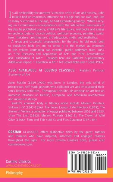 In all probability the greatest Victorian critic of art and society, John Ruskin had an enormous influence on his age and our own, and like so many Victorians of the age, he had astonishing energy. While carrying on a voluminous correspondence with the intellectual luminaries of his day, he published poetry, children's literature, and books and essays on geology, botany, church politics, political economy, painting, sculpture, literature, architecture, art education, myth, and aesthetics. A great and successful propagandist for the arts, he did much both to popularize high art and to bring it to the masses as evidenced in this volume containing two essential public addresses from 1857 on "The Discovery and Application of Art" and "The Accumulation and Distribution of Art." Included here are Ruskin's Supplementary Additional Papers: . Education in Art . Art School Notes and . Social Policy. ALSO AVAILABLE AT COSIMO CLASSICS: Ruskin's Political Economy of Art JOHN RUSKIN (1819-1900) was born in London, the only child of prosperous, self-made parents who collected art and encouraged their son's literary activities. Throughout his life, his writings on art had an immense influence on British, European, and American architecture and industrial design. Ruskin's immense body of literary works include Modern Painters, Volume I-IV (1843-1856); The Seven Lamps of Architecture (1849); The Stones of Venice, a collection of essays published between 1851 and 1853; Unto This Last (1862); Munera Pulveris (1862-3); The Crown of Wild Olive (1866); Time and Tide (1867); and Fors Clavigera (1871-84).