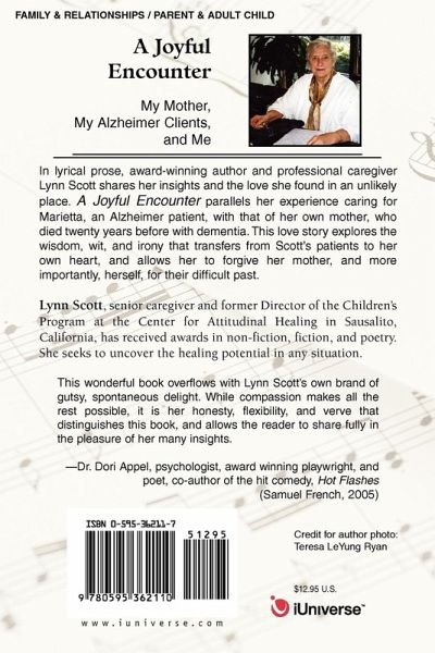 In lyrical prose, award-winning author and professional caregiver Lynn Scott shares her insights and the love she found in an unlikely place. A Joyful Encounter parallels her experience caring for Marietta, an Alzheimer patient, with that of her own mother, who died twenty years before with dementia. This love story explores the wisdom, wit, and irony that transfers from Scott's patients to her own heart, and allows her to forgive her mother, and more importantly, herself, for their difficult past. Lynn Scott, senior caregiver and former Director of the Children's Program at the Center for Attitudinal Healing in Sausalito, California, has received awards in non-fiction, fiction, and poetry. She seeks to uncover the healing potential in any situation. This wonderful book overflows with Lynn Scott's own brand of gutsy, spontaneous delight. While compassion makes all the rest possible, it is her honesty, flexibility, and verve that distinguishes this book, and allows the reader to share fully in the pleasure of her many insights. -Dr. Dori Appel, psychologist, award winning playwright, and poet, co-author of the hit comedy, Hot Flashes (Samuel French, 2005)
