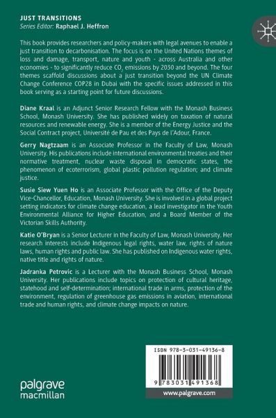 Chapter 1. Introduction: A just transition to decarbonisation.- Chapter 2. Climate Justice and Concept of Loss and Damage in Climate Negotiations.- Chapter 3. Zero-Emissions Transport: Taxation support for business electric cars.- Chapter 4. Water is Life - Recognising First Nations in Sustainable Water Management and Use.- Chapter 5. Utilising Free Trade Agreements to Protect Nature and Heritage.- Chapter 6. Youth Empowerment for a Just Transition.-Chapter 7. Conclusion.