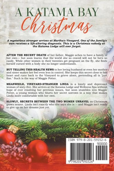 A mysterious stranger arrives at Martha's Vineyard. One of the family's own receives a life-altering diagnosis. This is a Christmas nobody at the Katama Lodge will ever forget. After the recent death of her father, Maggie aches to have a family of her own-- but soon learns that the world she so craved will not be hers so easily. While other women in their twenties get pregnant on the fly, she finds herself cursed with a body she no longer understands. But telling this health news to her loving husband or even her mother and sister makes her feel even less in control. She keeps this secret close to her heart and runs back to the Vineyard to grieve alone, pretending all is "just fine." Such is the way of Maggie Potter. Meanwhile, Vineyard-stranger Linda is a lonely and depressed woman of sixty-five. She arrives at the Katama Lodge and Wellness Spa without hope of ever resolving her previous issues, but soon stumbles into Maggie Potter, a young woman who blurts her secret sorrows in a way that makes Linda more comfortable with her own. Slowly, secrets between the two women unravel as Christmas grows nearer. Linda isn't exactly who she says she is -- and Maggie isn't ready to give up on her dreams just yet. Dive into book six of The Katama Bay Series -- a heartwarming journey of motherly and sisterly love, healing, and promise for better days, all on the island of Martha's Vineyard, with its gorgeous ocean views, its endless summer days, and its bubbly cast of islanders. For fans of Debbie Macomber, Robyn Carr and RaeAnn Thayne