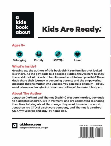 Growing up, the authors of this book didn't see families that looked like theirs. As the gay dads to 4 adopted kiddos, they're here to show the world that ALL kinds of families are beautiful and possible! These dads share their journey in becoming parents and the empowering message that no matter who you are, you can build a family-all you need is love (and maybe ice cream and silliness) to make it happen. Core themes in this book: Belonging, Family, LGBTQ+, Love Meet A Kids Co., a new kind of media company with a collection of beautifully designed books that kickstart challenging, empowering, and important conversations for kids and their grownups. Learn more about us at akidsco.com.