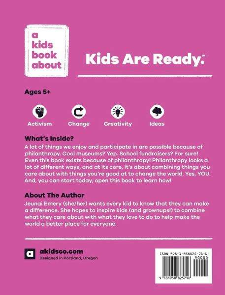 A lot of things we enjoy and participate in are possible because of philanthropy. Cool museums? Yep. School fundraisers? For sure! Even this book exists because of philanthropy! Philanthropy looks a lot of different ways, and at its core, it's about combining things you care about with things you're good at to change the world. Yes, YOU. And, you can start today; open this book to learn how! ¿¿ Core themes in this book: Activism, Change, Creativity, Ideas Meet A Kids Co., a new kind of media company with a collection of beautifully designed books that kickstart challenging, empowering, and important conversations for kids and their grownups.