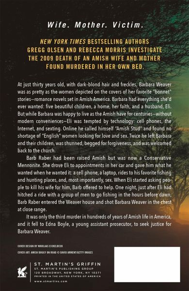 New York Times bestselling authors Gregg Olsen and Rebecca Morris investigate the 2009 death of an Amish wife and mother found murdered in her own bed. At just 30 years old, with dark-blonde hair and freckles, Barbara Weaver was as pretty as the women depicted on the covers of her favorite "bonnet" stories - romance novels set in Amish America. Barbara had everything she'd ever wanted: five beautiful children, a home, her faith, and a husband named Eli. But while Barbara was happy to live as the Amish have for centuries - without modern conveniences, Eli was tempted by technology: cell phones, the Internet, and sexting. Online he called himself "Amish Stud" and found no shortage of "English" women looking for love and sex. Twice he left Barbara and their children, was shunned, begged for forgiveness, and had been welcomed back to the church. Barb Raber was raised Amish, but is now a Conservative Mennonite. She drove Eli to appointments in her car, and she gave him what he wanted when he wanted: a cell phone, a laptop, rides to his favorite fishing and hunting places, and, most importantly, sex. When Eli starts asking people to kill his wife for him, Barb offers to help. One night, just after Eli had hitched a ride with a group of men to go fishing in the hours before dawn, Barb Raber entered the Weaver house and shot Barbara Weaver in the chest at close range. It was only the third murder in hundreds of years of Amish life in America, and it fell to Edna Boyle, a young assistant prosecutor to seek justice for Barbara Weaver.