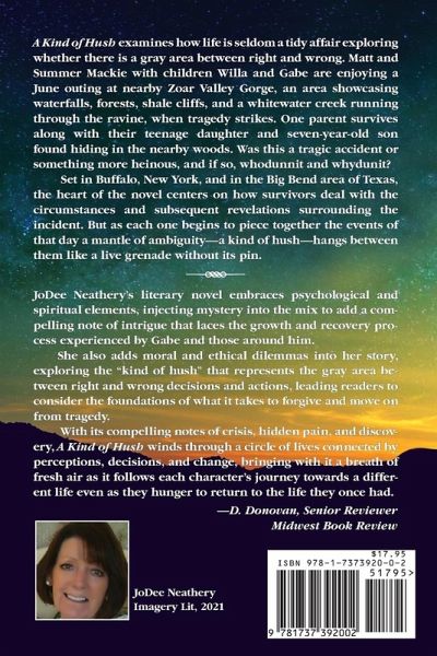 A Kind of Hush examines how life is seldom a tidy affair exploring whether there is a gray area between right and wrong. Matt and Summer Mackie with children Willa and Gabe are enjoying a June outing at nearby Zoar Valley Gorge, an area showcasing waterfalls, forests, shale cliffs, and a whitewater creek running through the ravine, when tragedy strikes. One parent survives along with their teenage daughter and seven-year-old son found hiding in the nearby woods. Was this a tragic accident or something more heinous, and if so, whodunnit and whydunit? Set in Buffalo, New York, and in the Big Bend area of Texas, the heart of the novel centers on how survivors deal with the circumstances and subsequent revelations surrounding the incident. But as each one begins to piece together the events of that day a mantle of ambiguity-a kind of hush-hangs between them like a live grenade without its pin.