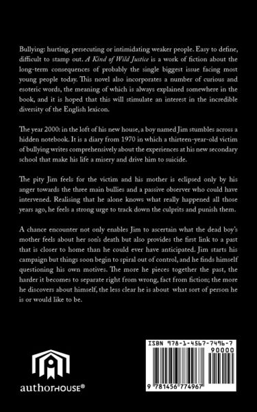 Bullying: hurting, persecuting or intimidating weaker people. Easy to define, difficult to stamp out. A Kind of Wild Justice is a work of fiction about the long-term consequences of probably the single biggest issue facing most young people today. This novel also incorporates a number of curious and esoteric words, the meaning of which is always explained somewhere in the book, and it is hoped that this will stimulate an interest in the incredible diversity of the English lexicon. The year 2000: in the loft of his new house, a boy named Jim stumbles across a hidden notebook. It is a diary from 1970 in which a thirteen-year-old victim of bullying writes comprehensively about the experiences at his new secondary school that make his life a misery and drive him to suicide. The pity Jim feels for the victim and his mother is eclipsed only by his anger towards the three main bullies and a passive observer who could have intervened. Realising that he alone knows what really happened all those years ago, he feels a strong urge to track down the culprits and punish them. A chance encounter not only enables Jim to ascertain what the dead boy's mother feels about her son's death but also provides the first link to a past that is closer to home than he could ever have anticipated. Jim starts his campaign but things soon begin to spiral out of control, and he finds himself questioning his own motives. The more he pieces together the past, the harder it becomes to separate right from wrong, fact from fiction; the more he discovers about himself, the less clear he is about what sort of person he is or would like to be.