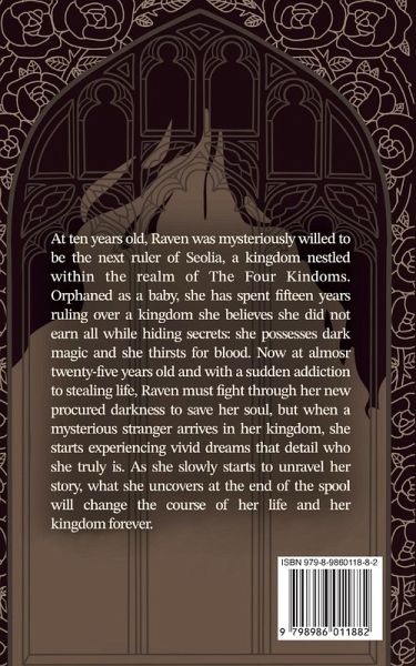 At ten years old, Raven was mysteriously willed to be the next ruler of Seolia, a kingdom nestled within the realm of The Four Kingdoms. Orphaned as a baby, she has spent fifteen years ruling over a kingdom she believes she did not earn all while hiding secrets: she possesses dark magic, and she thirsts for blood. Now at almost twenty-five years old and with a sudden addiction to stealing life, Raven must fight through her new procured darkness to save her soul, but when a mysterious stranger arrives in her kingdom, she starts experiencing vivid dreams that detail who she truly is. As she slowly starts to unravel her story, what she uncovers at the end of the spool will change the course of her life and her kingdom forever.