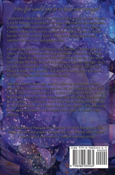 How far would you go to have your revenge? Shattered by the murder of her faery mother, Cenere knows that she, a lowly human, is powerless to avenge her, until her faery guardian, Luthian of Mithrax, offers her a deal... and a crown. As a queen, Cenere will have the power to bring her mother's killer to justice, but the fae give nothing freely. The price Luthian asks is total surrender to his every passionate whim and devious machination. Exiled from the Court of Pleasure and Torment, Luthian seeks to return to his life of hedonism and perversion. Cenere will become his way back into the graces of the sadistic King Arcus. She need only pledge her body and will to Luthian. Under his tutelage, she'll be able to infatuate the court-and the King's rakish second son, Prince Cassan. Her guardian will do the rest, and place Cassan on his father's throne with Cenere beside him. But when the doomed king sets his sights on the human woman who will be his undoing, her guardian can no longer keep her safe. Cenere finds herself protected by Prince Kathras, the heir to Arcus's throne and a faery far more dangerous than his father. Torn between her guardian, a cruel prince, and a kind one, Cenere knows her fate is out of her hands. And Luthian has his own secrets. When his true motivation is revealed, it will change the course of Cenere's life forever... A Kingdom of Pleasure and Torment is a Dark Romantasy with strong themes and graphic imagery that may disturb some readers. Please consult the extensive content warnings inside.