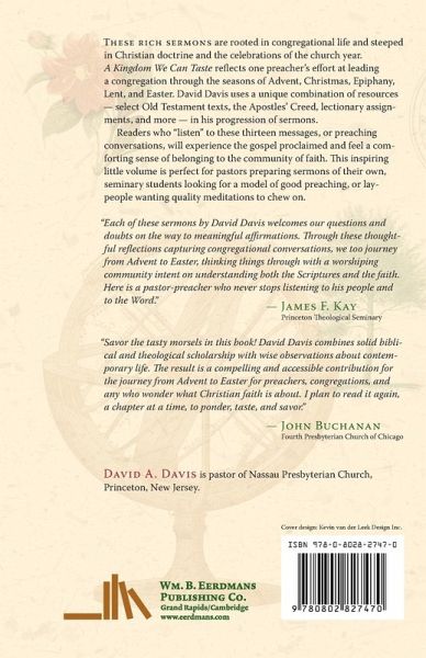 These rich sermons are rooted in congregational life and steeped in Christian doctrine and the celebrations of the church year. A Kingdom We Can Taste reflects one preacher's effort at leading a congregation through the seasons of Advent, Christmas, Epiphany, Lent, and Easter. David Davis uses a unique combination of resources -- select Old Testament texts, the Apostles' Creed, lectionary assignments, and more -- in his progression of sermons. Readers who "listen" to these thirteen messages, or preaching conversations, will experience the gospel proclaimed and feel a comforting sense of belonging to the community of faith. This inspiring little volume is perfect for pastors preparing sermons of their own, seminary students looking for a model of good preaching, or laypeople wanting quality meditations to chew on.