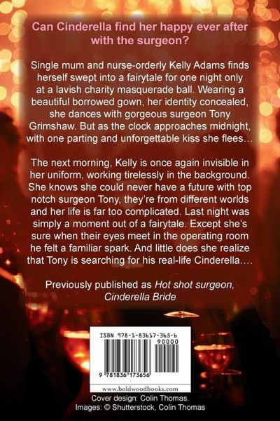 Can Cinderella find her happy ever after with the surgeon? Single mum and nurse-orderly Kelly Adams finds herself swept into a fairytale for one night only at a lavish charity masquerade ball. Wearing a beautiful borrowed gown, her identity concealed, she dances with gorgeous surgeon Tony Grimshaw. But as the clock approaches midnight, with one parting and unforgettable kiss she flees... The next morning, Kelly is once again invisible in her uniform, working tirelessly in the background. She knows she could never have a future with top notch surgeon Tony, they're from different worlds and her life is far too complicated. Last night was simply a moment out of a fairytale. Except she's sure when their eyes meet in the operating room he felt a familiar spark. And little does she realize that Tony is searching for his real-life Cinderella.... Previously published as Hot shot surgeon, Cinderella Bride